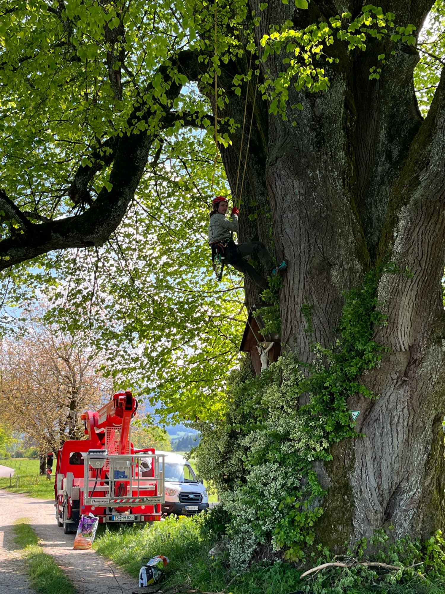 Um effizient Baumpflege ausführen zu können arbeiten wir mit Seilklettertechnik und Hebebühne. Mit voller Freude und einem starken Team an Baumspezialisten geht es oft hoch hinaus !!!